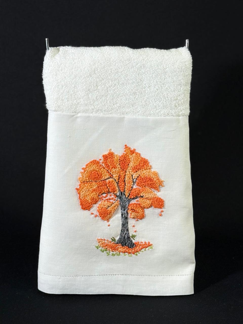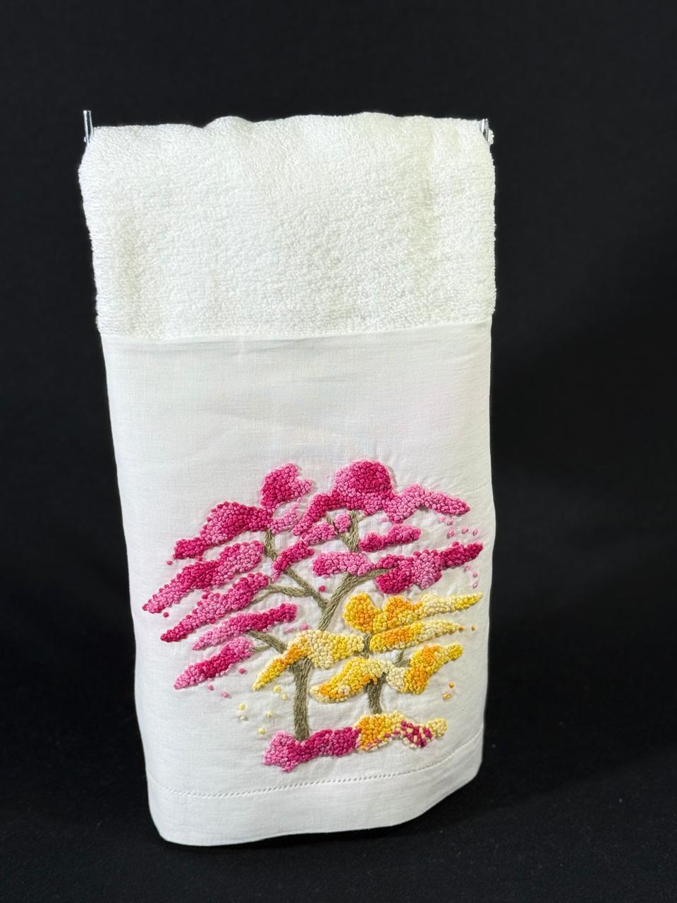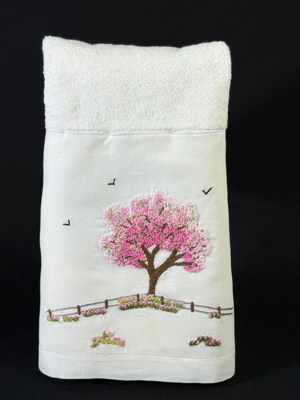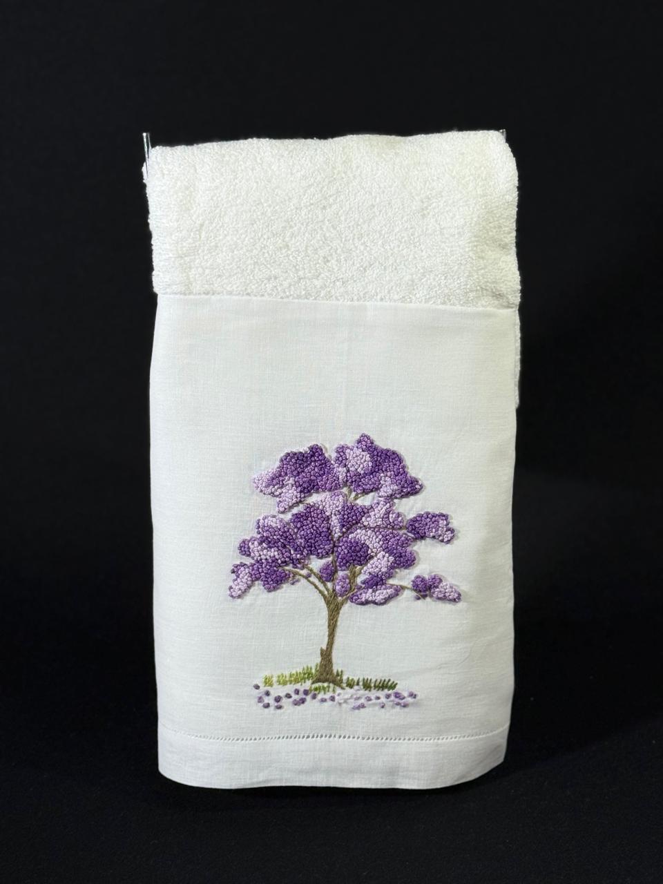 Tamanho: 48 x 98 cm. Bordada à mão na cambraia de linho, toalha da marca Buddmeyer.